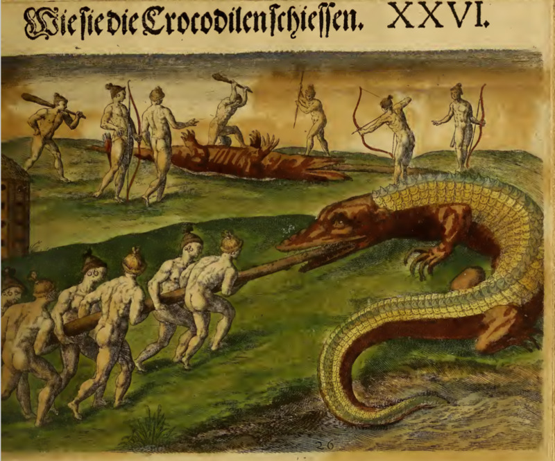 In the foreground, six Indigenous men ram a long log into the mouth of a large crocodile. Behind them, seven individuals surround a second crocodile, attacking it with clubs, spears, and bow and arrows. This illustration is identical to the one found on page 93 of Frankfurt 1591, but colored.