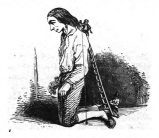 Here we see two Lilliputian tailors taking Gulliver’s measurements for new clothes. Gulliver is kneeling on the ground. One tailor stands on Gulliver’s shoulder and drops the weighted measuring tape down to the ground. A second tailor stands on the ground and records Gulliver’s measurements in a notepad. A tall ladder is leaning against Gulliver’s back. The same image appears in both the 1839 and 1843 Krabbe editions.