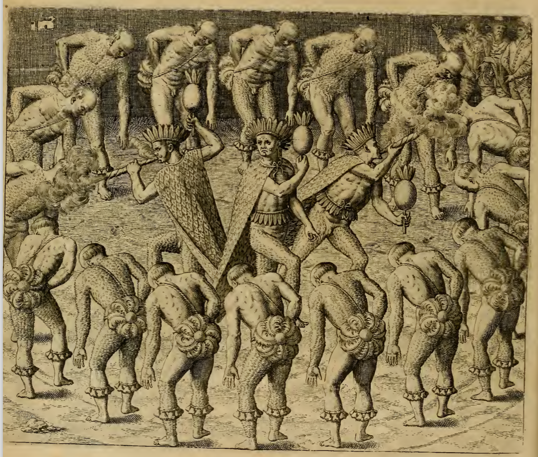 A group of Tupinambá men dance in a circle. They all wear round feathered adornments hanging down their backs and ornaments, possibly noisemaking, around their calves. The group dances around three men at the center of the circle. These men wear feathered headdresses, cloaks, and adornments around their waists. Two of them blow smoke from pipes towards the dancers, and all three hold a rattle or religious object with feathers on it. In the background, three European men stand and watch the ceremony.
