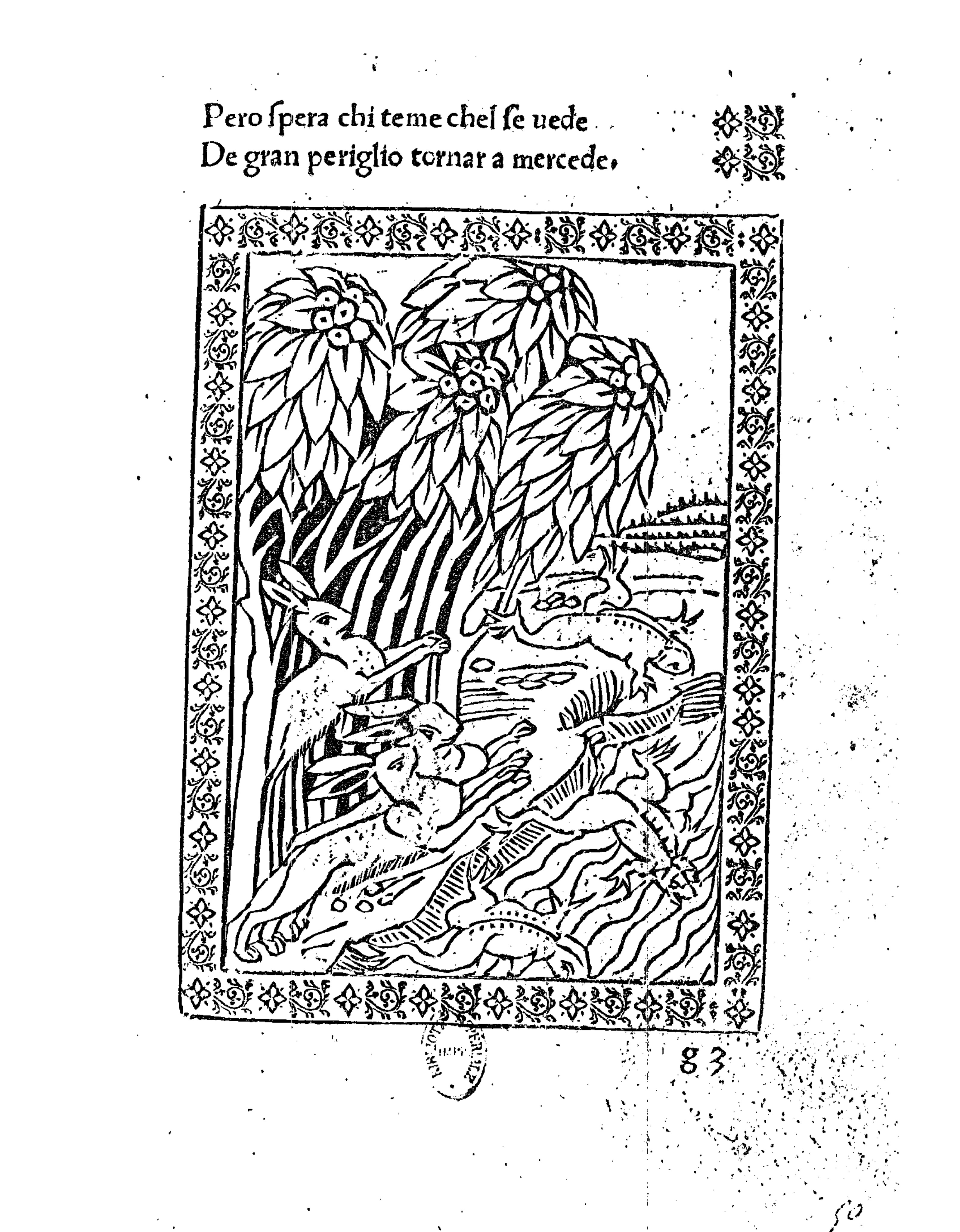 Rabbits and frogs are frantically jumping out of what looks like a dense forest into the open which almost looks like water. The image is bordered by a vine design and the signature of Liberale de Verona is stamped on the bottom, underneath the border.