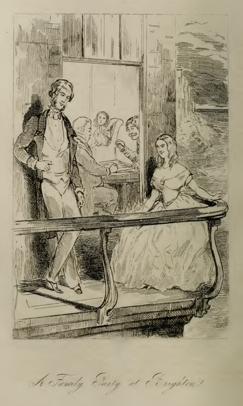 George Osborne and Rebecca Crawley are out on the balcony of the inn at Brighton, looking at the ocean. He is leaning against the house, facing out, while she is seated by the railing, facing him. Through the doorway, Joseph Sedley and Rawdon Crawley can be seen inside at the table, playing backgammon. In the far background, Amelia Osborne is sitting alone in an armchair, looking forlornly at the others. Below the illustration is printed in cursive its title, A Family Party at Brighton.