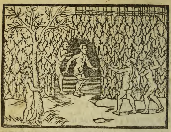 A European man stands captive in the entrance of a structure. He is nude, and his legs are bound with rope. Four Indigenous people stand around him and gesture towards him. The outside of the structure is covered in large leaves.