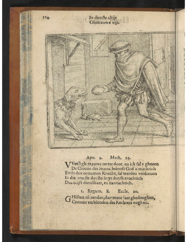 - The dog and the thief'; a man hidden under his mantle walks up to a dog at left with a loaf of bread in his hands; Dutch letterpress on verso; illustration to Eduwaert de Dene's edition of Aesop's Fables, De Warachtighe Fabulen der Dieren (Pieter de Clerck, Bruges: 1567). c.1567