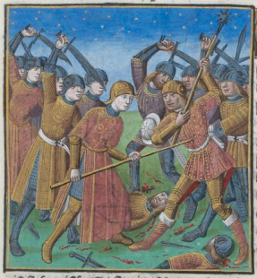 This illustration depicts the Amazons on the left side, with the Scythians on the right. It can be inferred that the Amazons are on the left as their skin is illustrated as being paler in comparison to those on the right, which is how women in antiquity were often depicted. There is also no facial hair on any of the figures on the left side, which further indicated that these are the Amazon women. Boccaccio explains that after the Scythians killed the Amazons husbands, they went to battle to seek vengeance. The Amazon woman at the front of the group on the left side is presumed to be either Martesia or Lampedo, who were the queens of the Amazons.