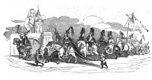 In this image we see a procession of Diplomats from Blefuscu arriving on Lilliput to make peace. The Emperor of Blefuscu is in the centre of the image riding a white horse and wearing a long cape which is being held up by his attendants. The Blefuscudian Emperor is also wearing a different shaped hat than the others in the party. In the front of the procession is a heralder riding a black horse and announcing their arrival by trumpeting on an instrument. Behind the Emperor is a procession of other diplomats and nobles, one of whom is carrying the banner of Blefuscu. Gulliver is looking on from behind a tower within the walls of Lilliput. The same image appears in both the 1839 and 1843 Krabbe editions.