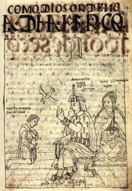 This illustration depicts Don Martín de Ayala, the father of author Felipe Guaman Poma de Ayala sitting on a small throne in the centre of the image. He is illustrated holding a rosary in his right hand and gesturing to his stepson with his left. His stepson, Martín de Ayala, is illustrated kneeling before his step-father who is teaching him about his doctrine and God. Don Martín de Ayala’s wife, Doña Juana Curi Oclla Coya, is pictured beside him on the right of the image sitting cross-legged. Their names are written above their heads to identify them. The script written at the feet of Don Martín reads en la ciudad del Cuzco which translates to In the city of Cusco. There is a dove flying above Martín de Ayala’s head which symbolizes the Holy Spirit.