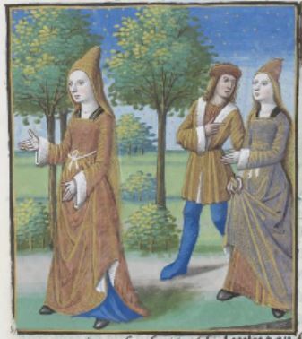 This image depicts a woman named Sulpicia walking on the left side of the image while a male servant and a maid follow behind her. Sulpicia’s husband, Lentulus Cruscellio, had been proscribed by the triumvirs, and to avoid being proscribed he fled to Sicily to live in exile. Sulpicia left her life behind in the middle of the night with two maids and two male servants to meet her husband in exile. Boccaccio writes on Sulpicia to praise her bravery of leaving her comfortable life to be with her husband.