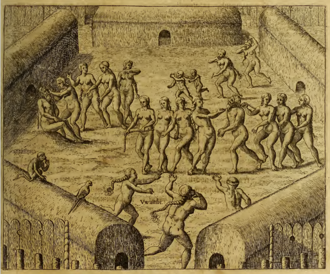 A European man is held captive inside a Tupinambá village, which is comprised of five long structures arranged in a pentagon and surrounded by a fence. The village is labelled ‘Uwattibi’. The man is shown having his hair cut by a Tupinambá woman in the left, and then on the right he is shown standing in a group of women with a rope tied around his neck. Several Tupinambá women hold both ends of the rope and dance around the man. There are two children present as well, and a monkey and parrot sit on top of one of the buildings on the left.