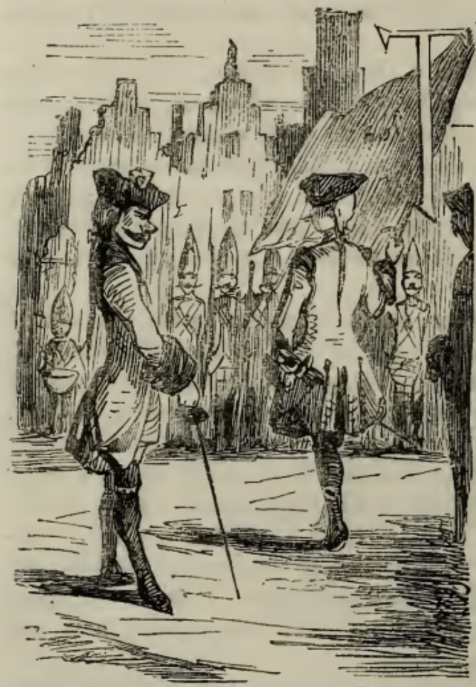 - A soldier with a thick moustache stands with one foot out and his sword pointed to the ground. Another soldier is next to him, facing away. In the background, a row of guards can be seen. In the top right corner of the image is the letter T, from The.