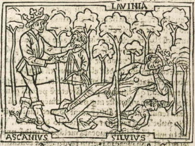 This engraving depicts Lavinia, wife of Aeneas and queen of Laurentum, hiding in the forest in fear of her step-son, Ascanius. Lavinia had given birth to a son who she named Silvius. Boccaccio explains that after Aeneas died, Lavinia fled to the forest as she was afraid that her step-son, Ascanius, would kill her. Lavinia was wrong, and Ascanius voluntarily gave the kingdom of Laurentum back to her and helped raise Silvius. Lavinia’s name is engraved at the top of the illustration, and Silvius’ name is engraved below his body at the bottom of the engraving. Ascanius is pictured on the left-hand side of the engraving with his hand touching a young Silvius’ face with brotherly affection.