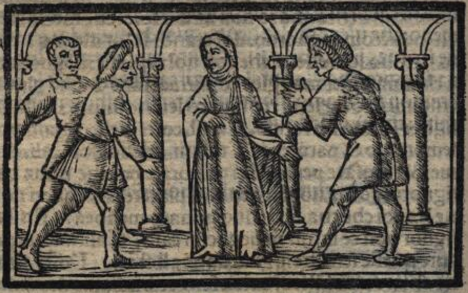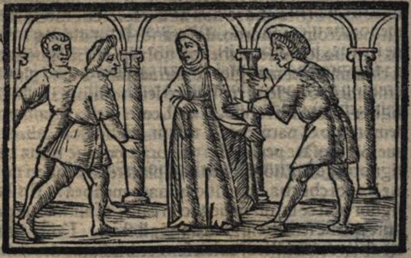 In the centre of the illustration, we see a female figure wearing a robe and a veil. There are two male figures to the left and one to the right. Because there are no female characters in Act XIII, we can say that this illustration does not relate to the events contained within the act.[This illustration is identical to those found in Acts IV (folio 32r), V (folio 42r), VI (folio 45r), VIII (folio 62r), X (folio 74r), XV (folio 102r), and XVII (folio 109r).]