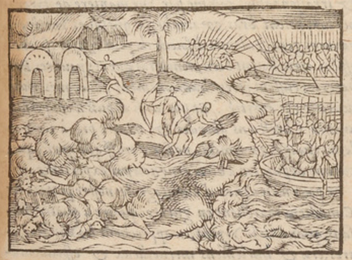 A group of Indigenous Canadians (identified as such by the author) attacks the village of another group. The attackers arrive by canoe, bearing spears, bows and arrows, and torches. Some of them set fires along the shore and in the village. A few individuals on the left flee the fire by running and crawling away in an attempt to avoid the smoke. This illustration is a simplified and mirrored version of the one found on page 156 of Paris, 1557.
