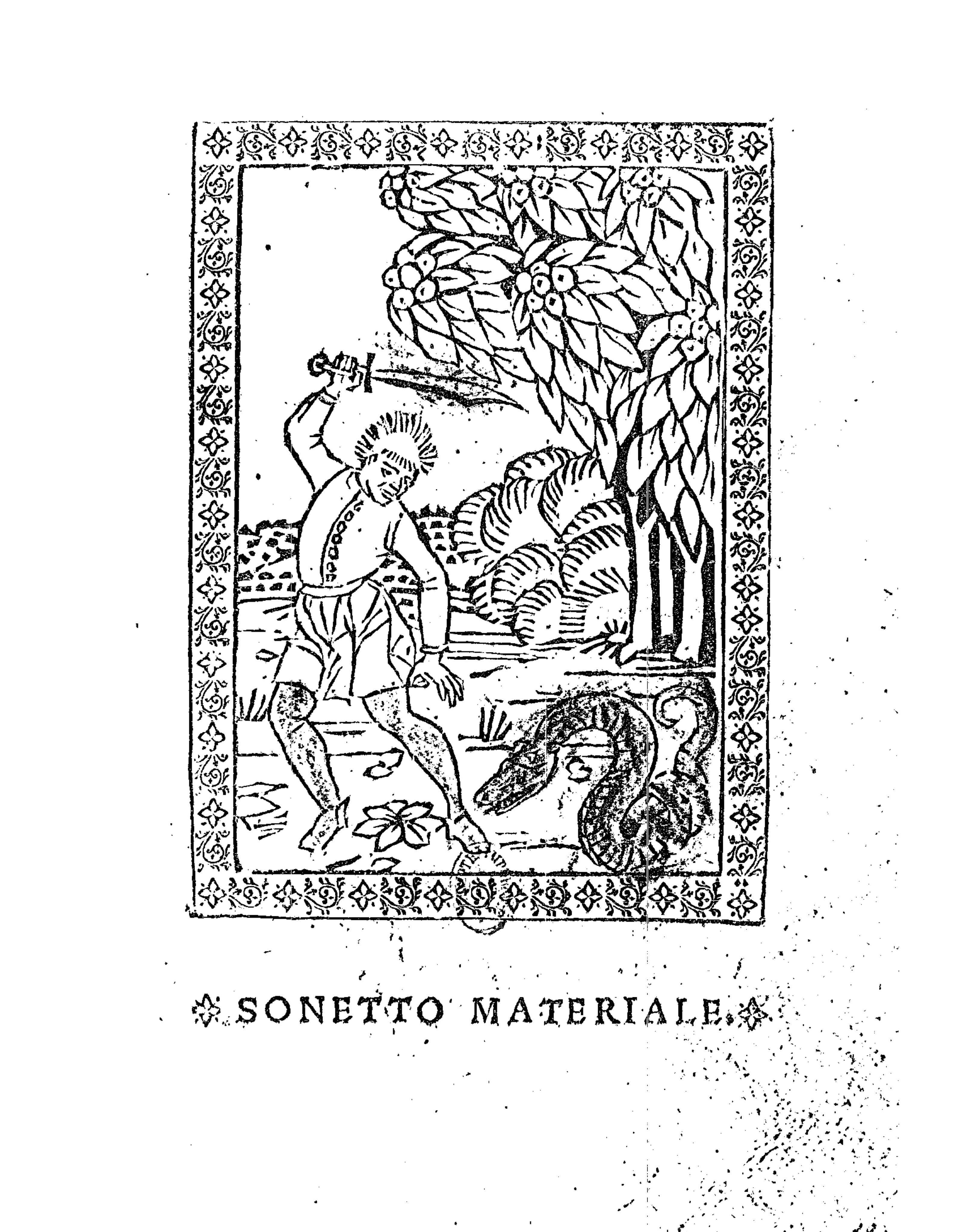 A man is in battle stance weilding a sword above his head looking down at a large serpent which looks like it is about to strike. They are underneath a Tree and many bushes in the backround. The image is bordered by a vine design and the signature of Liberale de Verona is stamped on the bottom