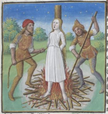 This image depicts Poppaea Sabina, the wife of Emperor Nero being burned alive. There is a man on the left side of the image tying her up while the man on the right pokes at the fire. This image is not reflective of the genuine story of Poppaea Sabina in the way that Boccaccio describes it. Boccaccio describes that Poppaea died by getting kicked in the abdomen while pregnant by Emperor Nero in a fit of rage.