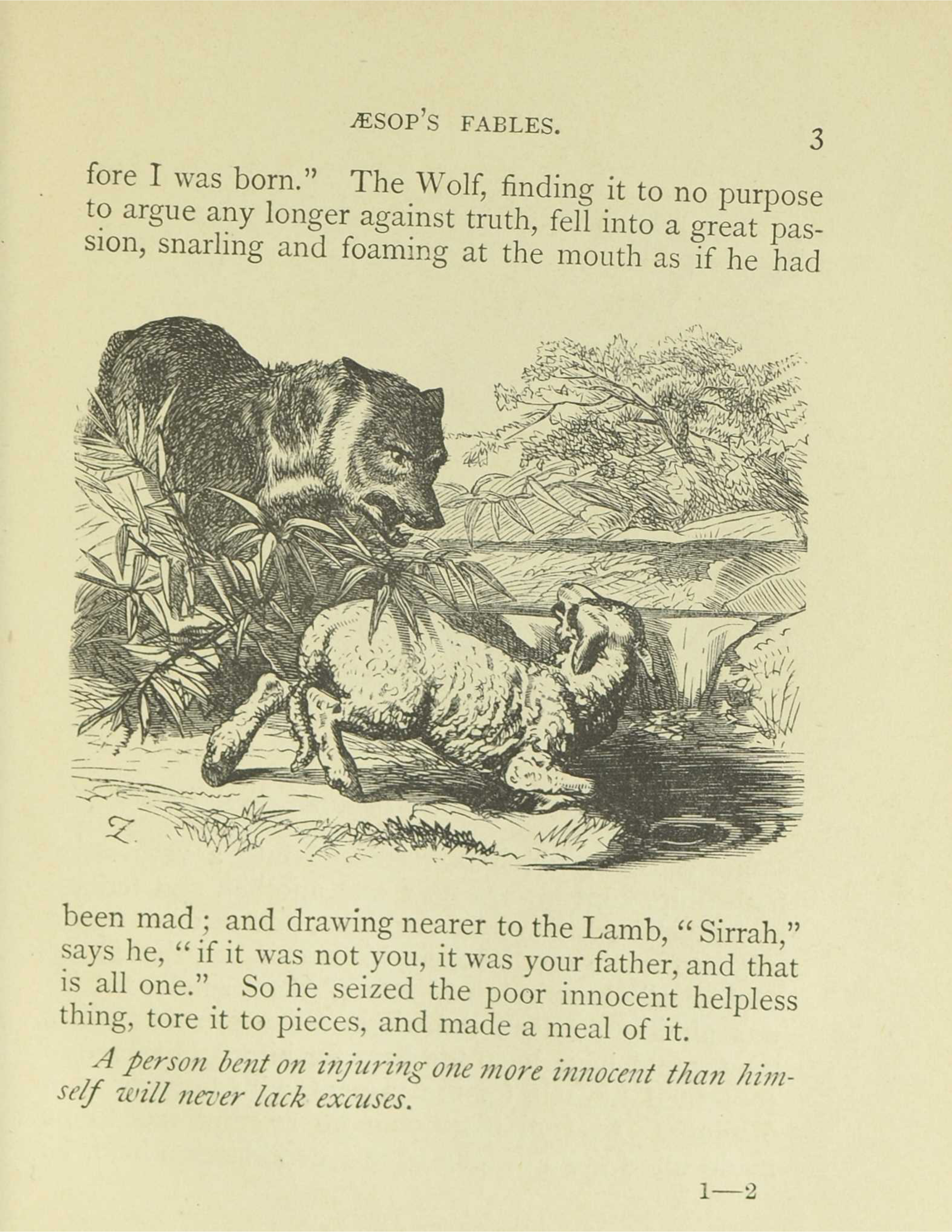 One hot, sultry day, a Wolf and a Lamb happened to come, just at the same time, to quench their thirst in the stream of a clear silver brook that ran tumbling down the side of a rocky mountain. The wolf stood upon the higher ground, and the Lamb at some distance from him down the current.