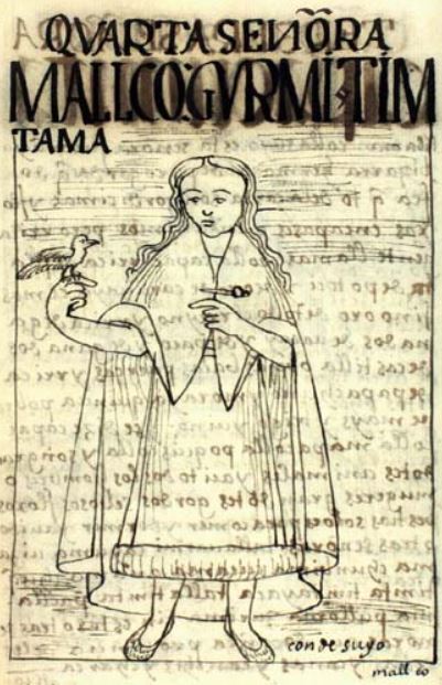 This illustration depicts the fourth lady of the region Condesuyu in the Inca Empire. Her name was Mallco Huarmi Timtama. The words conde suyo are written at the bottom of the image to identify Condesuyu as the region this image takes place in. The author explains that she came from a poor background but was still a good person. She is depicted standing in the centre of the image wearing a large cloak and holding a small bird in her right hand.