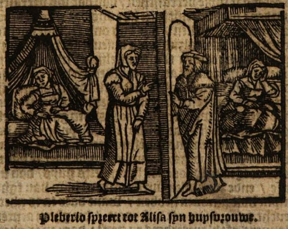 Melibea overhears her parents Pleberio and Alisa discussing her purity, how they should start trying to find a husband for her, and their belief that she has probably never considered having a male companion. Melibea starts to grow frustrated with their assumption that she is ignorant, and she tells Lucrecia to enter the room and interrupt the conversation. This illustration likely represents the scene in which Lucrecia interrupts Pleberio and Alisa. The left side of the image depicts Melibea and Lucrecia. Melibea is likely the figure seated on the ornate and draped bed, while Lucrecia is approaching the door with her finger pointed toward Pleberio (which is somewhat odd, since it implies a confrontation or argument). Each of the them is wearing a robe and a veil. The right side of the image depicts Pleberio, who is wearing a hat and a cloak of sorts, as he opens the door for Lucrecia. Meanwhile, Alisa sits on another ornate and draped bed while displaying an air of sadness, likely at the thought of finding someone for Melibea to marry.The entire image is identical to the one found on page 264 of the text.