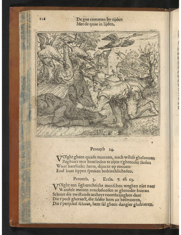 - A man at right, catching a deer in a net at left; birds are flying away in different directions; Dutch letterpress on verso; illustration to Eduwaert de Dene's edition of Aesop's Fables, De Warachtighe Fabulen der Dieren (Pieter de Clerck, Bruges: 1567). c.1567Etching