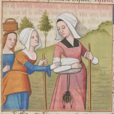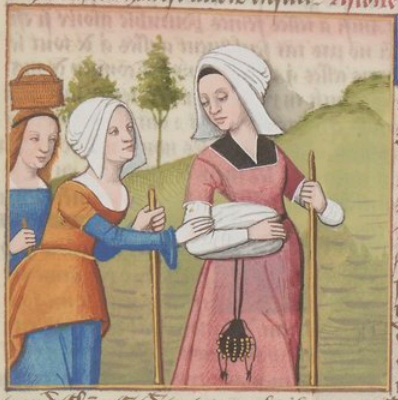 This illumination depicts a woman named Sulpicia leaving her home to find her exiled husband. Her husband, Lentulus Cruscellio, had evaded proscription and fled to Sicily to live in exile. Sulpicia was incredibly devoted to her husband and left the comfort of home to follow him into exile. There are two other women in the image, one of them being Sulpicia’s mother, Julia. Julia is illustrated grabbing her daughter’s arm to stop her from leaving. Sulpicia is depicted with a walking stick as she carries her belongings in her right arm.