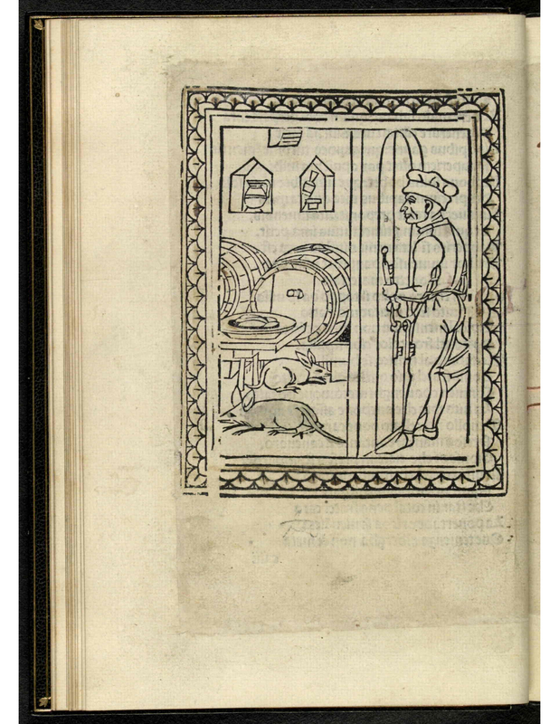 The right-half of the image is a man on one side of a door. The man wears a hat, possibly a chef’s hat, and holds a set of keys. On the left-half of the image is a storage room with wine barrels, and a table with a plate sitting atop it. On the ground are two large rodents. Three wall shelves are holding vases and other instruments.