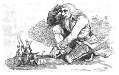 [Gulliver kneeling and saluting the Lilliputian Emperor]