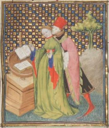 This illumination depicts a Greek woman named Leontium. Boccaccio explains that Leontium was an intellectual scholar and philosopher and became renowned for criticizing and speaking against certain philosophers of her time. Leontium is depicted standing in the centre of the image with books sitting on a podium beside her. These books are reflective of her intellectual life. There is also a man holding Leontium as he stands behind her. This is depicted due to her becoming a prostitute later in her life. Boccaccio believes her fame was hindered by becoming a prostitute.