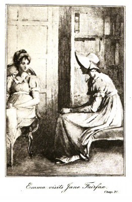 Here we see Emma visiting with Jane Fairfax. Jane Fairfax is the granddaughter of the elderly Mrs. Bates. She came to Highbury to visit her grandmother and her aunt Miss. Bates. She was orphaned young and was taken in by a friend of her father, Colonel Campbell. Miss Fairfax was a very accomplished pianist, and quite popular with the residents of Highbury. Emma, however, did not like Miss Fairfax. It comes out that Miss Fairfax was engaged to Mr. Frank Churchill, the son of Mr. Weston, a close friend of the Woodhouse family. Frank Churchill lived with his aunt and uncle following the death of his mother in the north of England. He came to visit his father and his second wife, Emma’s governess in February. During this visit Frank Churchill flirted with Emma. In July, Emma found out that Frank Churchill had become engaged to Miss Fairfax the previous October, before either Frank Churchill or Jane Fairfax arrived in Highbury, but both kept their engagement a secret. In this image, Emma pays a visit to Jane shortly after her arrival in Highbury. This scene occurs in chapter 20 as noted underneath the title of this image. The characters are shown in the traditional regency style, with Emma and Harriet wear the regency style dress with an empire waist. Their hair is worn tied up, as was tradition for women after their coming out before the queen, signaling her entrance into society. Emma wears a bonnet to protect her face from the sun. Bonnets were a popular fashion in this period because a common pastime was going out for walks. The regency period dated to the early nineteenth century (1811-1820) when George, Prince of Wales, later George IV (r. 1820-1830), reigned as regent for his mentally ill father, King George III (r. 1760-1820). The Prince of Wales was a fan of Austen’s work, and she dedicates the novel to him. The regency period is associated with the rise of neoclassicism in art and fashion. The same image appears as an insert between pages 164 and 165 for the Dent 1893, 1894, 1895, 1896, and 1897 editions of Emma.