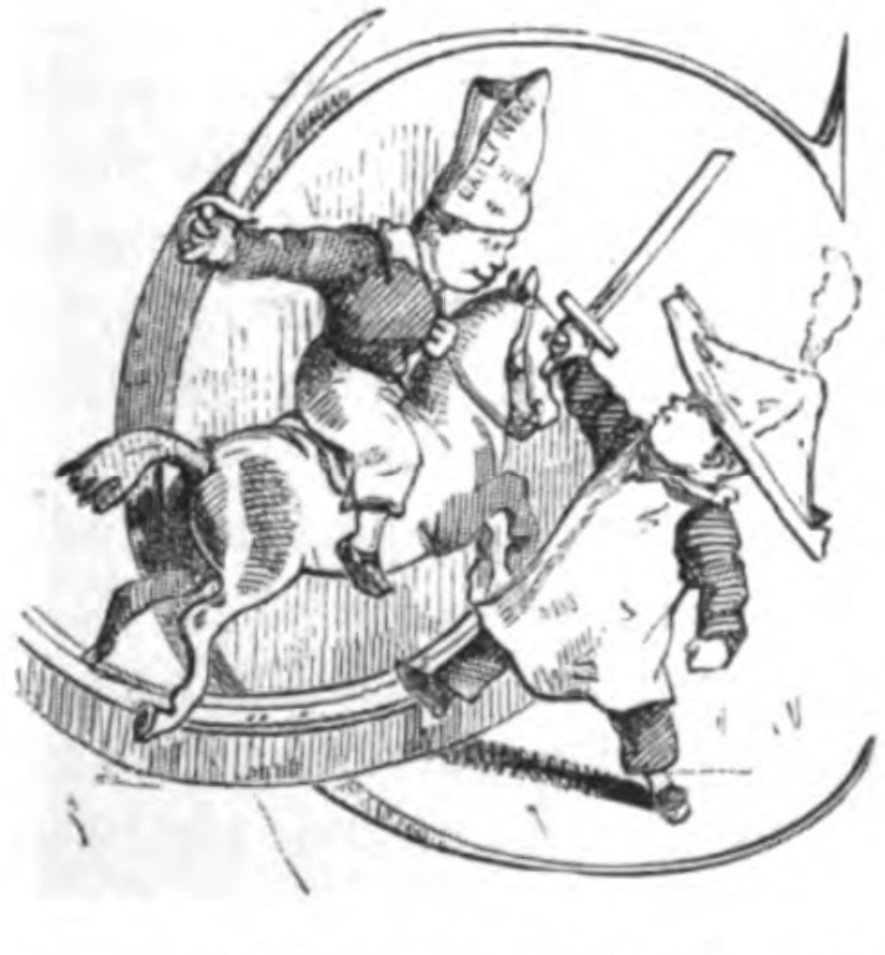 Two figures are depicted on a backdrop of the letter C from Cuff. The figure on the left is a boy with a toy sword and tall newspaper hat, riding a rocking horse, representing Cuff. This figure is bearing down on the other, representing William Dobbin, who has a triangular newspaper hat with a plume and a wooden sword raised to block his opponent.