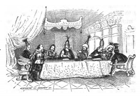 In this image we see a group of seven Lilliputian court officials and the Emperor at a table discussing Gulliver’s fate. Some argue that Gulliver should be pardoned or given a less severe charge than treason because of his work in defeating the Blefuscudian fleet during the war between Lilliput and Blefuscu. The Grand Admiral, however, insisted that Gulliver should be put to death because of his actions, specifically urinating on the Imperial Palace. The Grand Admiral is the second figure from the left in this image. He is wearing part of a suit of armour and does not wear a hat. The Emperor sits in the middle of the table, and can be identified by his headpiece with several large feathers coming out of the top. The men are seated in a large hall in the Imperial Palace. The throne can be seen in the distance behind the Emperor as can a row of columns on the right side and a large curtain on the left. The same image appears in the 1839 Krabbe edition.