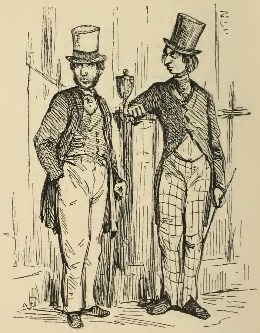 - Two assistants of Mr. Moses, the sheriff’s-officer, watching the residence of Rawdon and Rebecca Crawley on Chancery Lane. They are wearing black coats and tall hats, carrying thin sticks, and scowling.