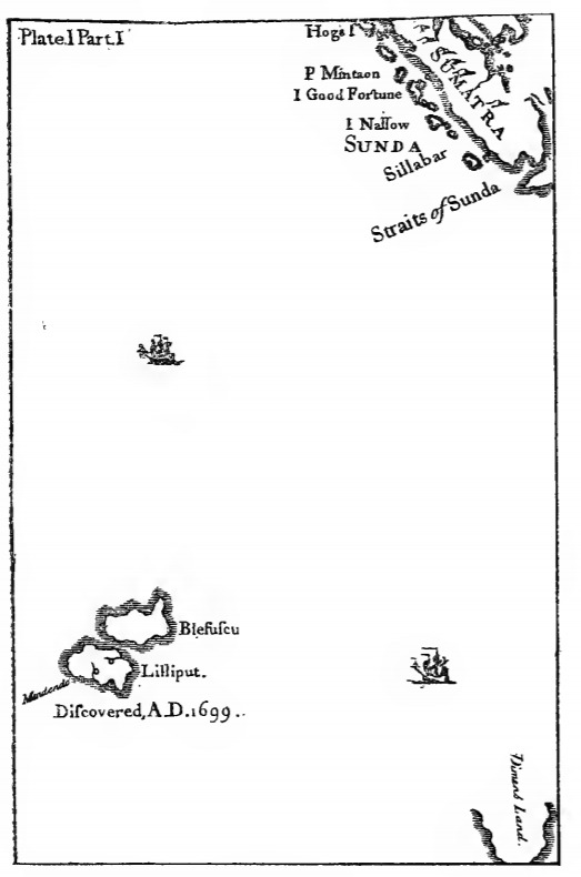 A map of depicting the fictional lands of Lilliput and Blefuscu that Gulliver visited in the first part of the story. Under the fictional lands is written Discovered, AD 1699. The map also depicts the lands of Sumatra and Diemen's Land. Two ships – likely the man-of-war type ships which were popular in the eighteenth century and are mentioned in the text – are shown. The same map is featured in several other editions of the text, including those in other languages.