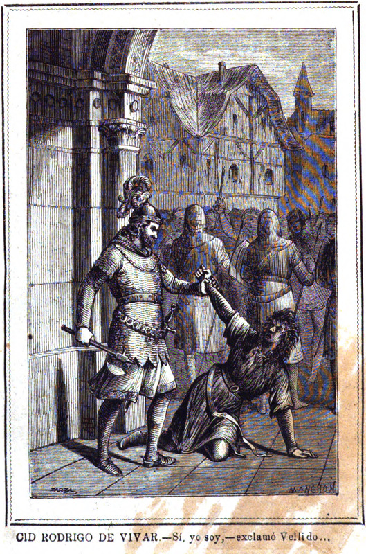 In this image the focus is on the two men, EL Cid and Vellido. El Cid is the bearded one wearing chainmail with a helmet with plumes on his head. On his waist the hilt of a sword is visible. He is using one of his hands to hold Vellido’s hand and the other is holding a small axe. Vellido is wearing armour as well and he has long thick hair. Behind these two men there are two soldiers wearing armour and carrying spears preventing the crowd from approaching. Behind the crowd there are a couple of wooden houses that are visible.