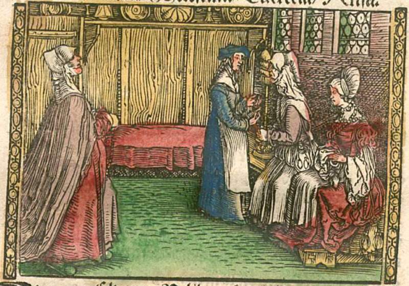 After Lucrecia (left-central figure) tells Celestina (right-central figure) that Melibea (rightmost figure) has requested her presence, they both go to Melibea’s house. There, Melibea informs Celestina about the pain in her heart and asks what the cause might be. [The identity of the leftmost figure is uncertain, since Alisa does not enter the scene until after the next illustration. This may be intended to represent another of Melibea’s servants.]
