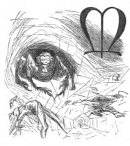 Here we see a satire of lawyers as a spider in a web. The image represents Gulliver’s unflattering views on lawyers as insects. The image represents lawyers wrapping up their clients by confusing them, just as spiders trap their prey in their webs. The image appears at the beginning of chapter six, and the letter M appears in the top corner because my is the first word of the chapter.