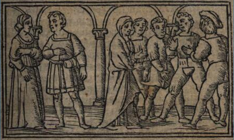 The left side of this illustration presumably depicts Calisto’s first encounter with Melibea. To the right, we see a group of figures. The leftmost figure in this group represents Celestina, who is wearing a robe and veil. Three of the remaning four figures would represent Calisto, Sempronio, and Pármeno, signalling that this is intended to represent the scene in which Celestina first visits Calisto. However, the presence of a fourth figure does not accord with the number of characters present in this scene.[This illustration is identical to those found in Acts VII (folio 52v), IX (folio 67r), XI (folio 80r), XII (folio 83v), XIV (folio 96v), XVI (folio 106v), and XIX (folio 115v).]