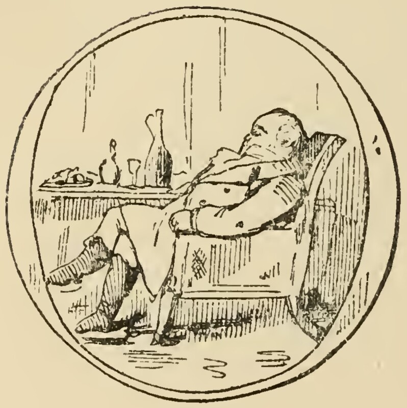 - Joseph Sedley is asleep at the dinner table, leaning back in his chair. On the table in front of him are the remains of dinner, including his plate and cup and a decanter. He is framed in the letter O from On.