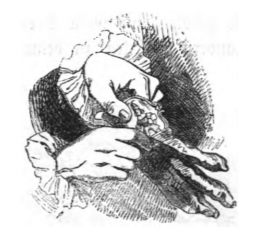 Here we see a pair of hands – likely Gulliver’s - pulling on a glove. The glove has a man embroidered on the cuff. The man has ruffles around his wrists. The image comes at the end of the first part, before Gulliver leave Blefuscu and returns to England. The same image appears in the 1839 Krabbe edition.