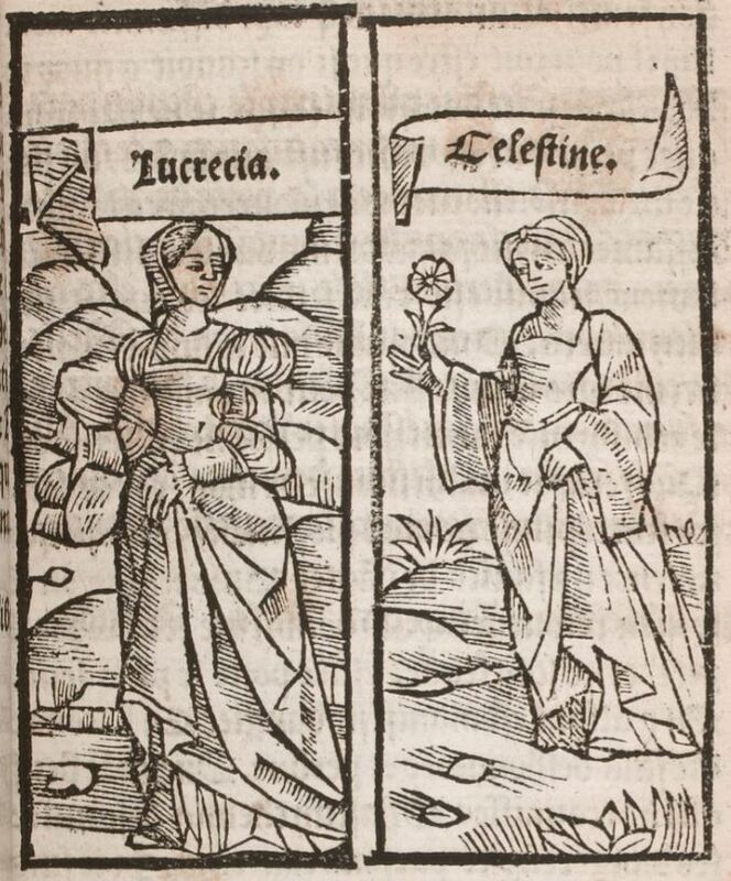 The left panel depicts Melibea’s servant Lucrecia, who is wearing a robe and a veil. To the right we see Celestina, who is also sporting a robe and a veil, holding a flower in her right hand. Both figures are placed outside.The left panel is nearly identical to those found on pages 12, 208 and 271 (where it is labeled ‘Melibea’), pages 173, 287, 306, and 317 (where it is labeled ‘Areusa’), and page 350 (where it is labeled ‘Alisa’). The right panel is nearly identical to those found on pages 235 (where it is labeled ‘Lucrece’), 287 (labeled ‘Elicia’), 299 (labeled ‘Alisa’), and 306 (labeled ‘Elicia’).