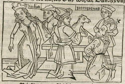 This engraving depicts two separate events. The right side of the engraving depicts Pompey the Great participating in a sacrifice of an animal. Pompey is depicted wearing a crown to signify his high status. The man to the left of Pompey is depicted cutting the neck of the animal that he is holding. There is blood splashing out from the animals wound, which stains Pompey’s clothing. Boccaccio explains that after Pompey’s garments became stained with the animal’s blood, a servant carried his stained clothes back home to get new ones. Julia, Pompey’s wife and the daughter of Julius Caesar, saw the blood-stained clothing of her husband and immediately thought that he had been murdered. Julia is depicted on the left side of the engraving after having just seen the clothing of her husband. She looks distraught and is depicted mid-fall to the ground. There is a servant beside her who is holding the blood-stained garments of her husband. Her name, written as Iulia, is engraved above her head to identify her. Similarly, Pompey’s name, written as Pompeius, is engraved above his head.