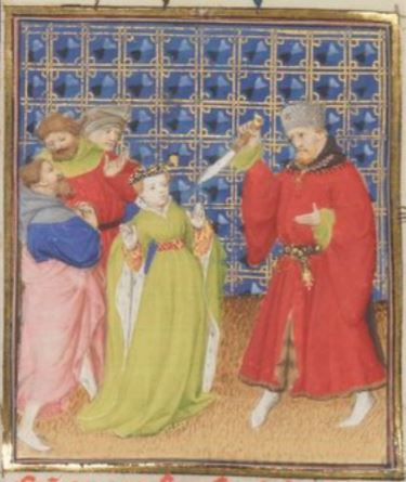This illustration depicts Verginius, a plebeian man, stabbing his daughter Verginia in the chest with a knife. Boccaccio explains that a man named Appius Claudius had fallen in love with Verginia, and although she was betrothed to Lucius Icilius, he devised a plan to make her his own. Appius Claudius, a judge and a decemvir, ordered a decree that stated she would become a slave so that he could own her. To protect his daughter’s chastity, Verginius stabbed Verginia as death would be better than her honour being destroyed. The men illustrated behind Verginius are most likely Appius Claudius and Lucius Icilius, as they were present in Boccaccio’s telling of the story.