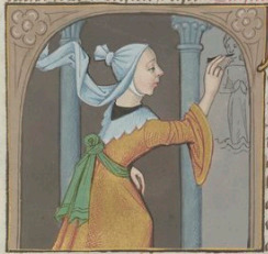 This illumination depicts a woman named Irene painting a portrait of a woman on a wall. Irene was a renowned, skillful painter during her time which Boccaccio believed to deserve praise as the arts were not a common practice of women. Boccaccio explains that Irene was the daughter of a man named Cratinus, who was also a painter (although much less renown).