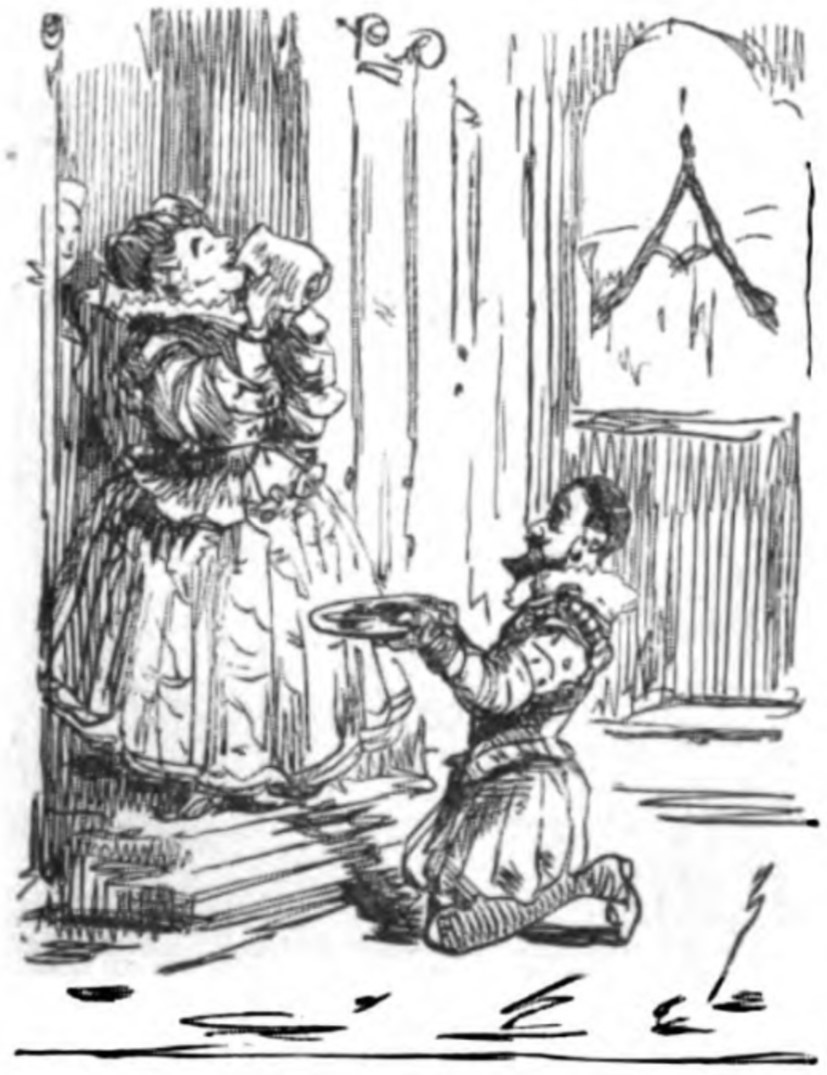 Queen Elizabeth I is depicted standing on a raised dais to the left of the image, drinking from a pitcher of beer she holds in both hands. In front of her is the ancestor of Pitt Crawley, a man with a pointed beard, kneeling and holding the platter from which the beer was taken. A slight figure of a guard can be seen behind the queen, and in the top right of the picture, the letter A from Among is seen through a window.