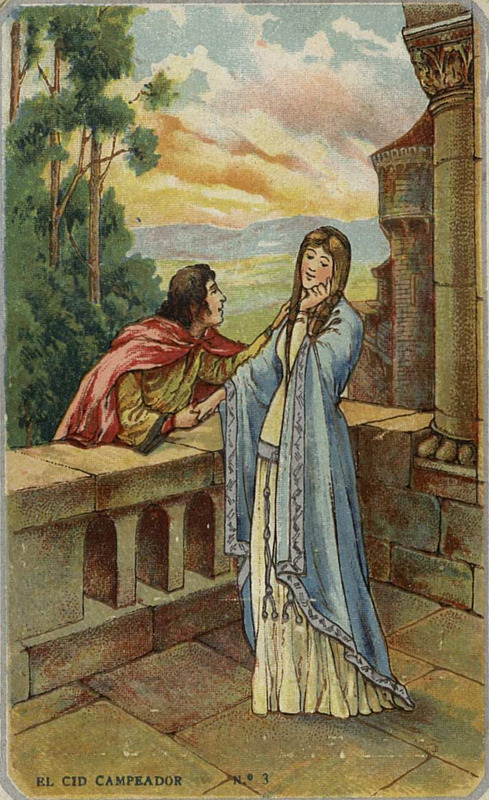 In this image El Cid is courting Jimena. El Cid has brown medium length hair wearing a yellow tunic and a red cloak. Behind El Cid there is a forest and the sky has lines of yellow suggesting sunrise. He is holding Jimena’s hand as her other rests on her cheek. She is wearing a blue and white dress and her blond hair is done up in two braids. She is standing on a balcony of a castle, which is also visible on the right of the image. The castle is made out of stone.
