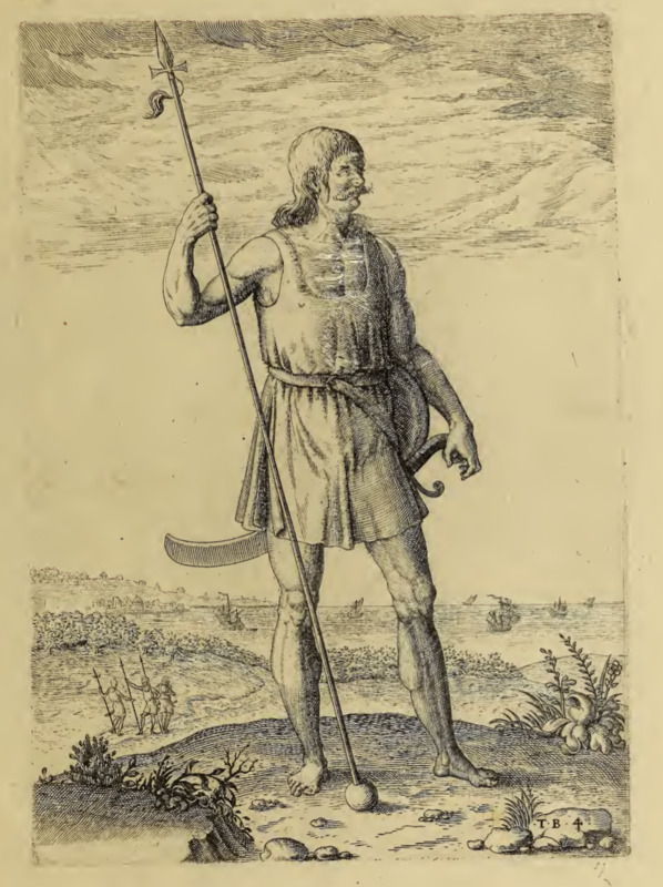 An Indigenous man is shown from the front. He carries a spear with a ball on the end in his right hand. He wears a belted tunic, and both a round shield and a sword with a curved blade hangs from the belt around his waist. This man is described as belonging to an Indigenous group that lived near the Picts. The Picts were an Indigenous group who lived in Britain long before the author’s time. Images of Picts were included in this book so that readers could compare their customs to those of the Indigenous people living in Virginia.