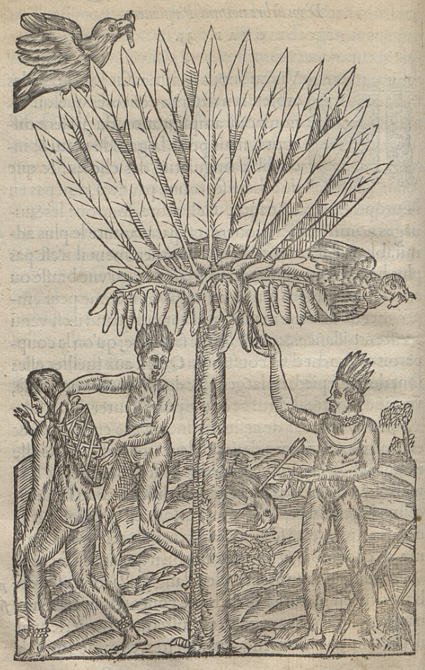 Three Indigenous people, two men and a woman, pick bananas from a tree and place the fruit in a basket that the woman carries on her back. Two birds swoop down and take fruit from the tree, and a third bird has been shot with an arrow. A bow and arrows rests on the ground behind the man standing on the right and the two men wear feathered headdresses. Bananas were introduced to Brazil by the Portuguese in the early 16th century. This image is identical to one found in Paris, 1557.