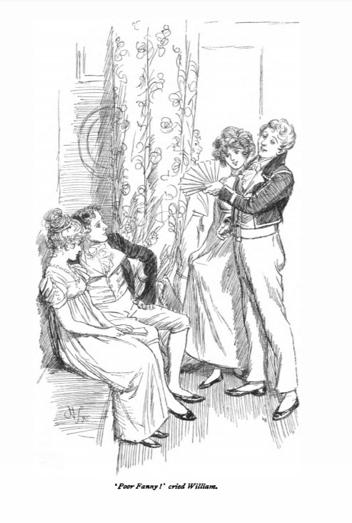 Here we see Fanny and Mr. Crawford sitting down at the ball with Edmund and Miss Crawford standing in front of them. Fanny got tired easily and after the first two dances went to sit down, and Mr. Crawford followed her, still trying to get her to fall in love with him. Edmund, who was dancing with Miss Crawford, came over to speak with them, and Edmund lamented Fanny’s weak constitution. This scene occurs in chapter 28. The characters are shown in the traditional regency style. Fanny and Miss Crawford wear regency style dresses with empire waists. Mr. Crawford and Edmund wear tailcoats, waistcoats, and cravats. The regency period dated to the early nineteenth century (1811-1820) when George, Prince of Wales, later George IV (r. 1820-1830), reigned as regent for his mentally ill father, King George III (r. 1760-1820). The regency period is associated with the rise of neoclassicism in art and fashion.