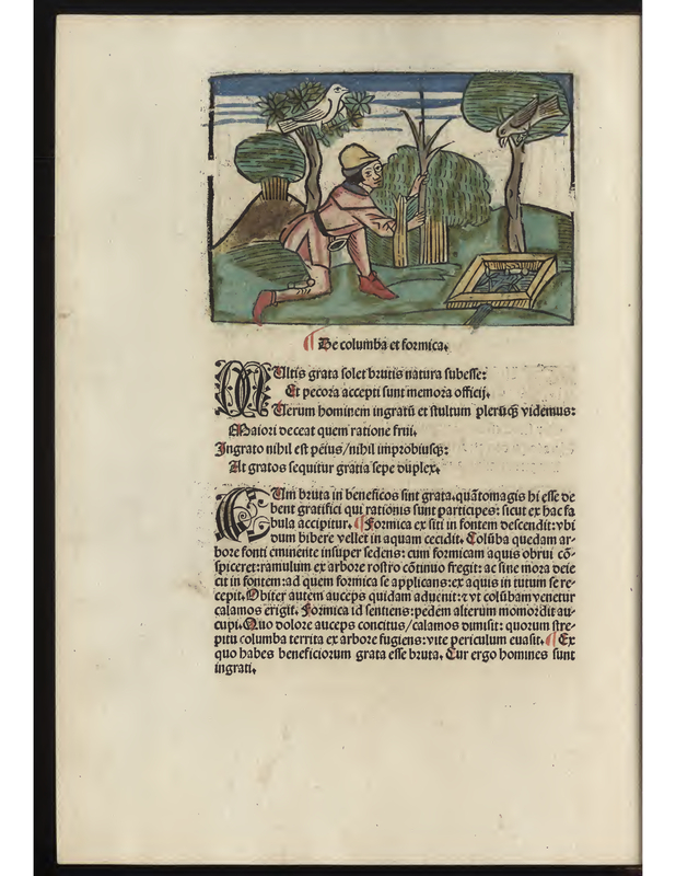 - The man crouches in between two trees holding an extended branch in the air. Two pigeons sit on each of the two trees.