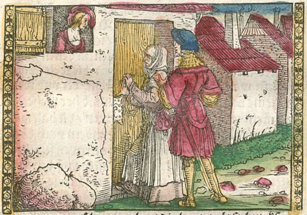 Sempronio (rightmost figure) arrives at the house of Celestina (central figure) and angrily chastises her for the slackness with which she is fulfilling Calisto’s request. She explains that she will be able to extract more compensation from Calisto if she takes her time. She asks him to join her in scamming Calisto, offering him an equal share of the profits and her prostitute Elicia (top-left corner, looking out from the window) in exchange for his loyalty. Sempronio readily agrees, and when Celestina departs for Melibea’s house, he stays behind to spend time with Elicia.