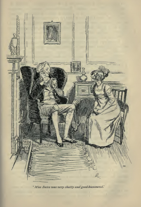 Here we see Mr. Woodhouse sitting with Miss Bates by the fire. They were both at a dinner party where Jane Fairfax played piano. Mr. Woodhouse was a hypochondriac and spent most of the evening sitting next to the fire, fearing catching a draft. Miss Bates kept him company, sitting and talking with him. This scene occurs in chapter 21. The characters are shown in the traditional regency style. Miss Bates wears a regency style dress with an empire waistline. Mr. Woodhouse wears a waistcoat and tailcoat with a cravat. The regency period dated to the early nineteenth century (1811-1820) when George, Prince of Wales, later George IV (r. 1820-1830), reigned as regent for his mentally ill father, King George III (r. 1760-1820). The regency period is associated with the rise of neoclassicism in art and fashion.