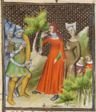 This illumination depicts the noble Roman matron Veturia speaking with her son, Coriolanus. Veturia was famous for saving Rome from what would have been a violent attack on the city. Her son had been exiled from Rome, and to exact his revenge, he planned an attack on the city with Volscian enemies. Veturia went and spoke to her son and convinced him to call off the attack. Veturia’s daughter-in-law and grandchildren are standing behind her. Coriolanus has his soldiers standing behind him on the left side of the image. According to Boccaccio, women began to gain more respect from men in Rome due to Vetruria’s actions.
